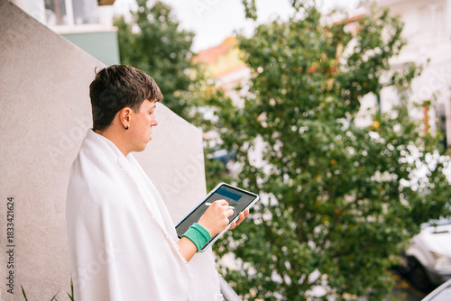 © teksomolika, Naklejka premium Individual wrapped in cloth views metropolis from high balcony