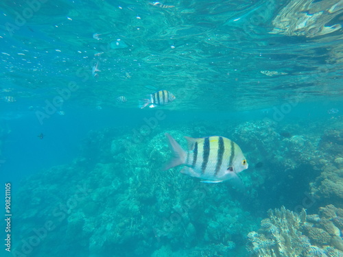 Fototapeta premium Indo-Pacific sergeant (Abudefduf vaigiensis) is a species of damselfish in the family Pomacentridae above coral reef in Red sea Egypt