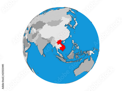 © harvepino, Fototapeta premium Indochina on blue political 3D globe. 3D illustration isolated on white background.