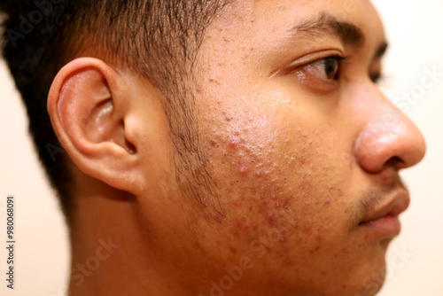Obraz premium Indonesian boy's face with pimples on cheeks, inflamed pimples.