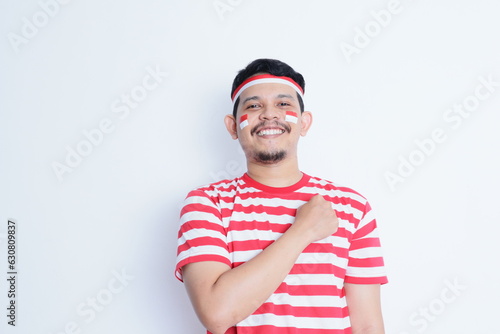 © IgnatiusHarly, Fototapeta premium Indonesian man looking to the camera with hand on chest showing proud gesture, celebrating Indonesia independence day.