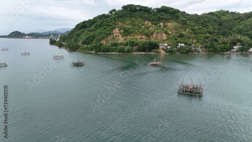 © Dian, Naklejka premium Indonesians call it "bagan"Bamboo rafts are assembled in the middle of the sea and used to catch fish