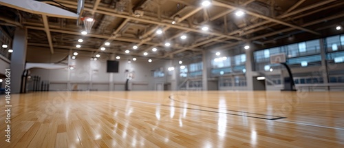 © pvl0707, Fototapeta premium Indoor basketball court with shiny wooden floor and bright overhead lights in a spacious gym setting designed for sports activities