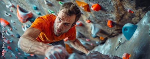 © PAOLO, Obraz premium Indoor climbing, sport. A man in an orange shirt rock climbing indoors, focused and gripping a climbing hold