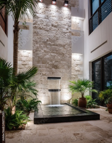 Fototapeta premium Indoor courtyard with stone wall, water feature, and tropical plants