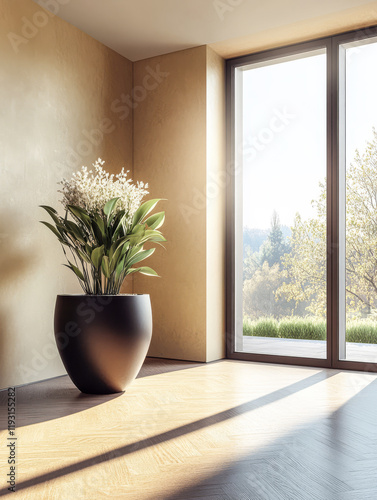 Fototapeta premium Indoor plant arrangement with sunlight illuminating a spacious modern room