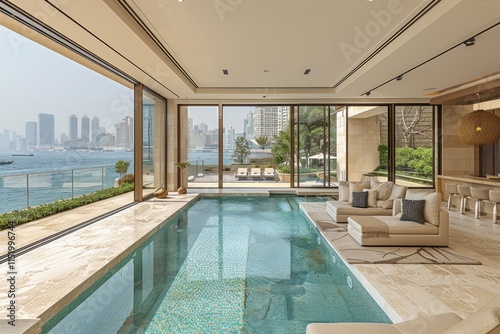 © NikahGeh, Obraz premium Indoor Pool with City Skyline View from a Luxurious Home