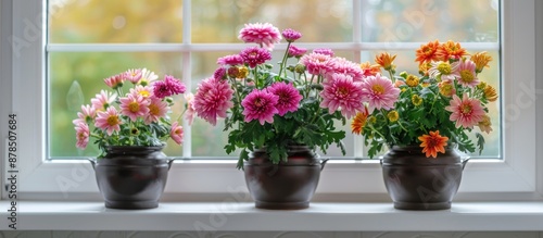 Fototapeta premium Indoor scene featuring stunning potted chrysanthemums on a white windowsill, with room for text in the image. image with copy space