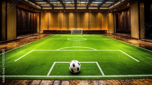 Obraz premium Indoor soccer field with ball at center.