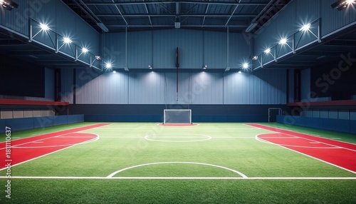 Obraz premium Indoor soccer field with markings, bright lighting, athletics, clean