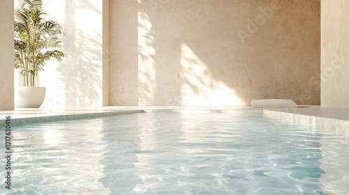 Fototapeta premium Indoor swimming pool with clear water and natural light illuminating a minimalistic space with a potted plant and Copy Space.