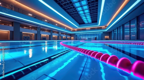 Naklejka premium Indoor swimming pool with illuminated lanes, modern architecture, and vibrant...