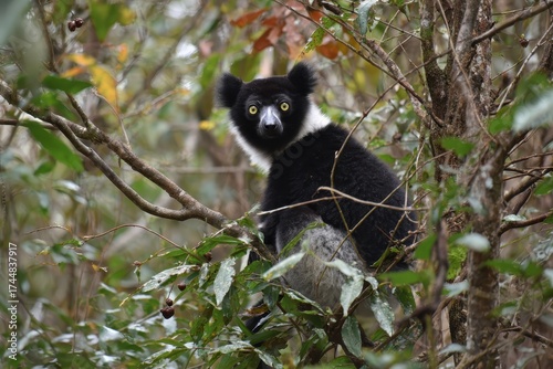 © Iftikhar alam, Obraz premium Indri lemur resting in the lush forests of Madagascar, showcasing its distinctive black and white fur, surrounded by vibrant green foliage during the early morning hours