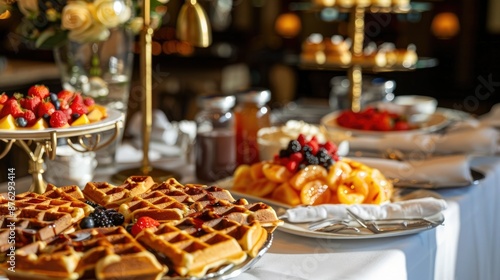 Fototapeta premium Indulgent Hotel Breakfast Buffet with Fluffy Waffles Fresh Berries and Maple...