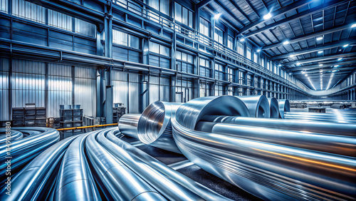 © Arethaawykoff, Fototapeta premium Industrial aluminum pipes and sheets in spacious warehouse, showcasing modern manufacturing environment with bright lighting and clean aesthetic