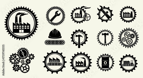Obraz premium Industrial and Engineering Icons Set with Gears, Factory, Wrench, Hard Hat,...