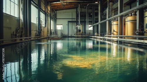 Fototapeta premium Industrial Building Interior With Large Pool Reflecting Machinery