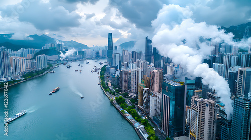 © Jiraphat.N, Obraz premium Industrial chimneys emitting smoke over urban landscape city riverfront aerial photography cloudy sky environmental impact