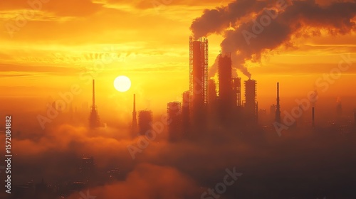 © Vins Space, Obraz premium Industrial City Skyline with Smokestacks Emitting Smoke During Sunset