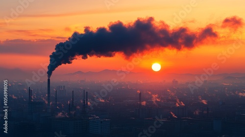 Naklejka premium Industrial Cityscape at Sunset with Smoke Plumes and a Distant Mountain Range
