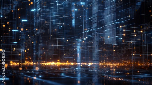 © Johannes, Fototapeta premium Industrial Complex at Night with Digital Network Overlay.