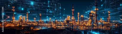 Fototapeta premium Industrial Complex at Night with Futuristic Digital Overlay