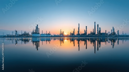 Fototapeta premium Industrial Complex at Sunset: Reflections on Water for Energy Production and...