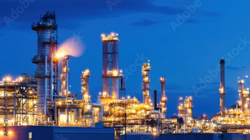 Fototapeta premium Industrial complex illuminated at night, showcasing towering structures and glowing lights against a twilight sky