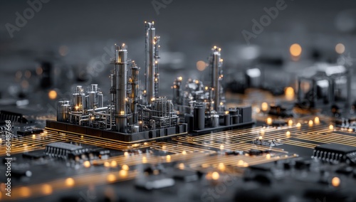 © hutan, Fototapeta premium Industrial complex miniature, atop circuit board