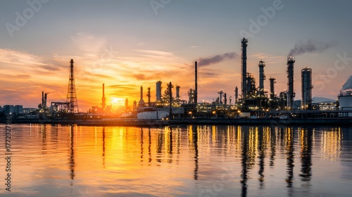 Fototapeta premium Industrial complex silhouette reflects vividly upon calm water during a...