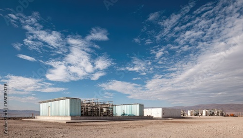Fototapeta premium Industrial complex under blue sky, with tanks and pipelines, remote location
