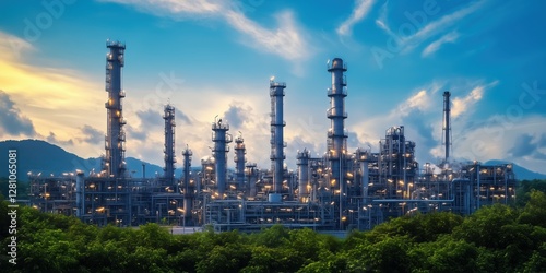 Fototapeta premium Industrial Complex with Smokestacks and Towers under a Dramatic Sky during Dusk, Surrounded by Lush Greenery and Mountains in the Background