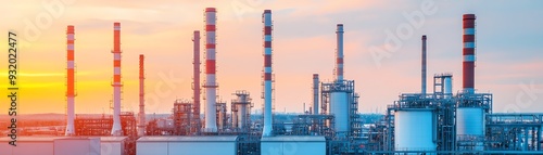 Fototapeta premium Industrial complex with tall chimneys against a sunset sky.