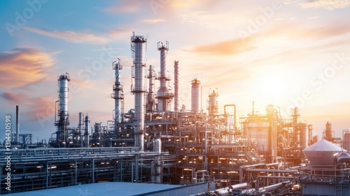 Obraz premium Industrial Complex with Towers Pipes and Tanks Against a Sunset Sky