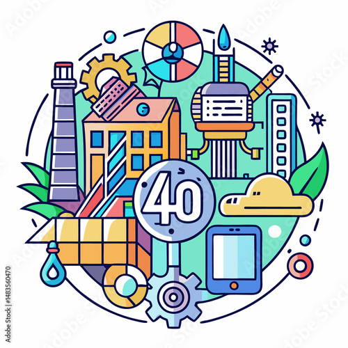 Fototapeta premium Industrial 4.0 concept illustration. A colorful graphic depicting various industrial elements, representing the interconnected systems of the fourth industrial revolution