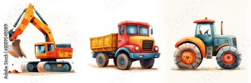 Fototapeta premium Industrial Construction Equipment: Excavator, Truck, and Tractor,...