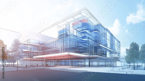 © AVADA, Fototapeta premium Industrial construction, wireframe rendering, technical illustration Create a blueprint for a modern office building emphasizing energy efficiency