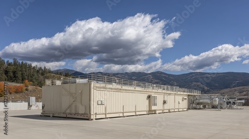 Fototapeta premium Industrial Container Unit with Mountain Background under Blue Sky