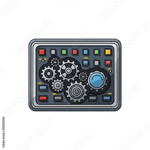 © Ariestia, Fototapeta premium Industrial control panel featuring an interconnected system of mechanical cogs and indicator lights