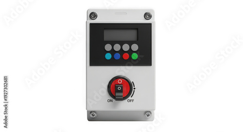 © MstMita, Fototapeta premium Industrial control panel with red dial and buttons isolated on transparent background