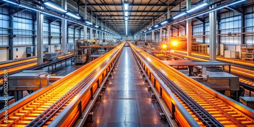 © Ruby, Fototapeta premium Industrial Conveyor Belt in a Factory with Glowing Orange Tracks - A Symmetrical View of Modern Manufacturing