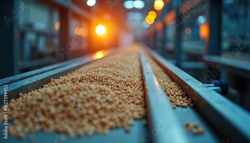 © Vadym, Naklejka premium Industrial conveyor belt moves biomass pellets. Closeup of organic fuel material under artificial light. Renewable energy production process in a factory.