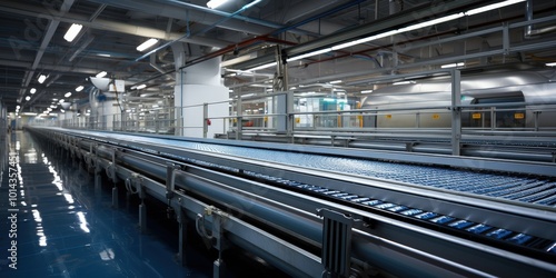 Fototapeta premium Industrial conveyor belt system in a factory setting with a blue floor and...