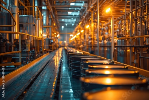 © djatinako, Fototapeta premium Industrial Conveyor Belt with Metal Barrels at Factory
