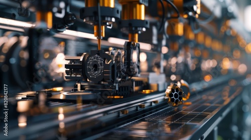 Fototapeta premium Industrial 3D printers in action, producing intricate components, network...