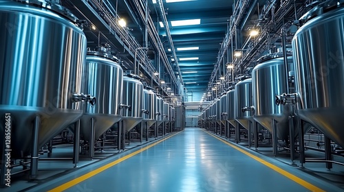 Fototapeta premium Industrial dairy production plant. Rows of large stainless steel tanks for milk storage, processing. Pipes