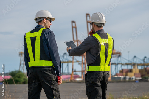 Obraz premium Industrial engineer workers operations marine port cranes loading and...