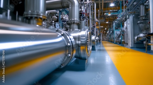 Fototapeta premium Industrial facility interior showcasing large metallic pipes and machinery along a yellow pathway