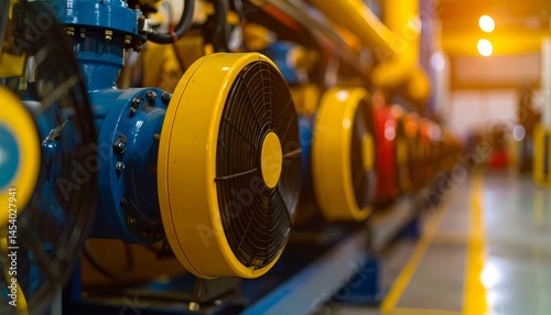 © Chatchawan, Obraz premium Industrial Facility's Powerful Cooling System Close up of Yellow and Blue Industrial Fans