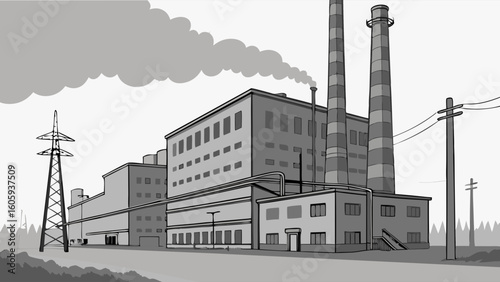 © maya, Fototapeta premium Industrial Factory Complex with Smokestacks Against Cloudy Sky in Urban Setting